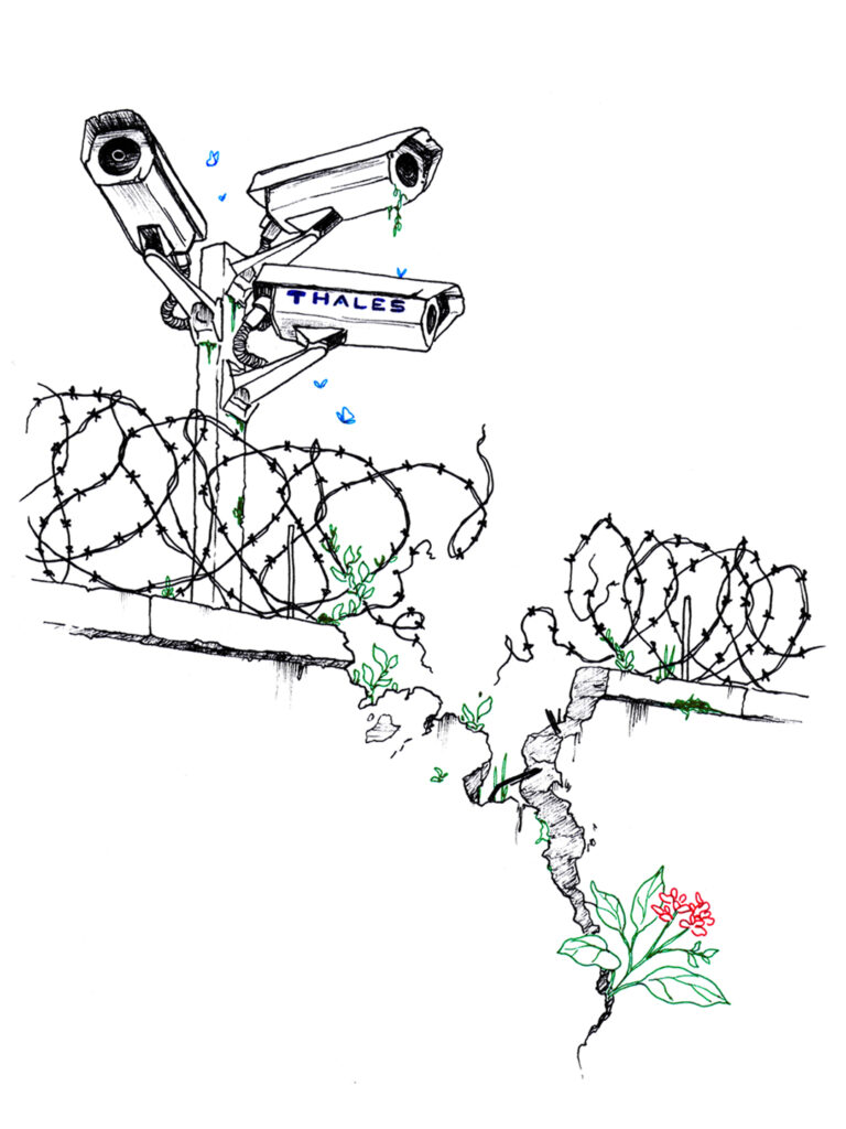 Décorons chaque matin les façades de leurs tristes bâtiments, brandissons les drapeaux de tous les peuples opprimés aux yeux de ceux qui se croient innocents, débranchons leurs caméras à reconnaissance faciale et leurs intelligences artificielles mortifères, bloquons les routes qui mènent à leurs usines et soutenons les luttes des travailleur·ses pour la reconversion vers le domaine médical, transformons leurs open-spaces en habitats collectifs autogérés et occupons leurs chantiers pour y planter des champs d’oliviers, introduisons-nous partout où nous pouvons être le grain de sable qui fera s’enrayer la machine, pour en finir avec l’impunité et le silence dans lesquels se fait le commerce de la mort en France.