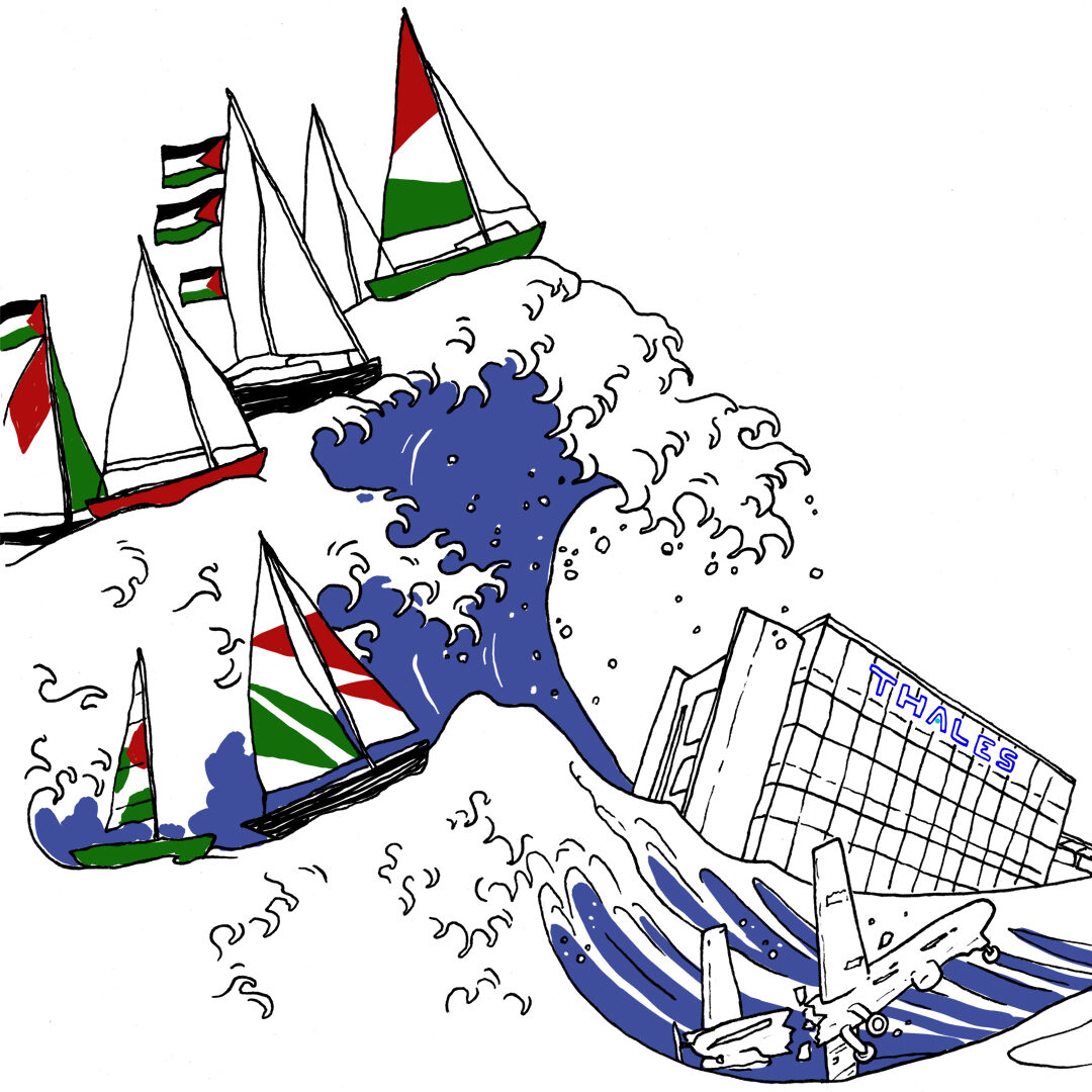 Partout dans le monde, ce sont les peuples qui s’organisent pour lancer une nouvelle vague de flottilles et briser le blocus maritime de la bande de Gaza . À terre, au cœur de la machine de guerre impérialiste, nous pouvons contribuer au renversement du rapport de force. La coalition Guerre à la guerre a d’ores et déjà identifié Thales en tant que cible incarnant le système contre lequel nous avons choisi de lutter. Thales est également l’un des rouages les plus importants de la complicité active de la France dans le génocide du peuple palestinien.