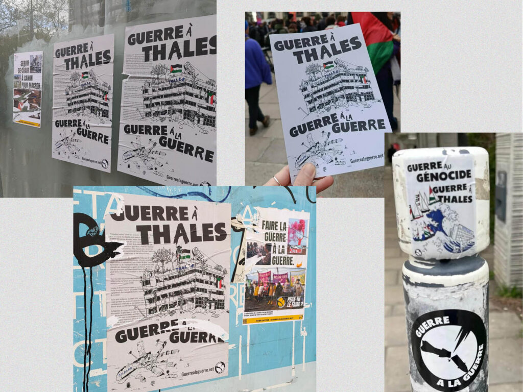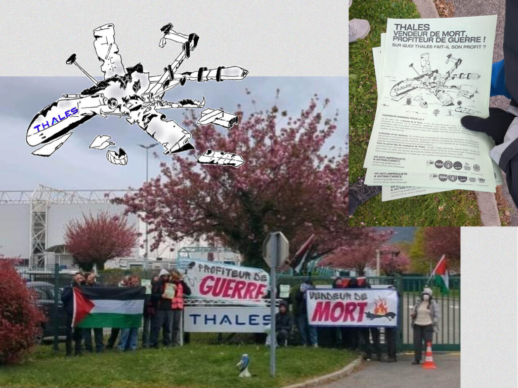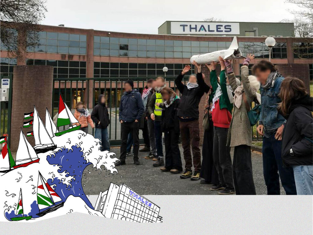 Depuis plusieurs semaines, les collages se multiplient dans de nombreuses villes de France pour dénoncer la complicité matérielle de Thales dans le génocide du peuple palestinien. Près de Grenoble, un rassemblement a eu lieu devant le site de Thales AVS à Moirans : des banderoles ont dénoncé les profits mortifères de l’entreprise tandis que des tracts appelant à se mobiliser contre les guerres impérialistes et les frontières étaient distribués. En Belgique, à Tubize, une cinquantaine de manifestant·es ont bravé l’interdiction initiale du rassemblement prévu devant l’usine Thales locale, et ont symboliquement formé une rampe de lancement humaine pour lancer une roquette (en papier mâché) couverte de sang par dessus la grille de l’entreprise.