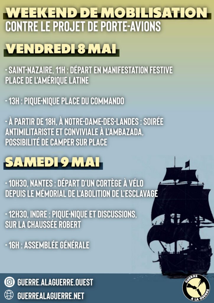 Le 8 mai 2026, la coalition régionale « Guerre à la Guerre Grand-Ouest » appelle à une manifestation populaire et unitaire à11h, Place de l’Amérique Latine à Saint Nazaire. Cette ville par son histoire et son actualité est au cœur de la militarisation du territoire ligérien. Entièrement rasée pendant la seconde guerre mondiale, elle s’apprête à accueillir l’un des plus importants investissements militaires français de ces prochaines années : la construction d’un porte-avion nucléaire. 10 milliards d’euros d’investissement, alors que cet argent pourrait servir à construire une autre industrie et produire des choses utiles à tous·tes ! Les chantiers navals nazairiens s’apprêtent à enrôler plus de travailleur·euse·s détach·e·s pour construire une arme de destruction massive. Près de Nantes, Naval Group prévoit de bétonner les bords de Loire et d’étendre son site de production pour produire les réacteurs nucléaires de propulsion du futur porte-avion. La guerre globale se fabrique près de chez nous. Nous pouvons riposter localement.